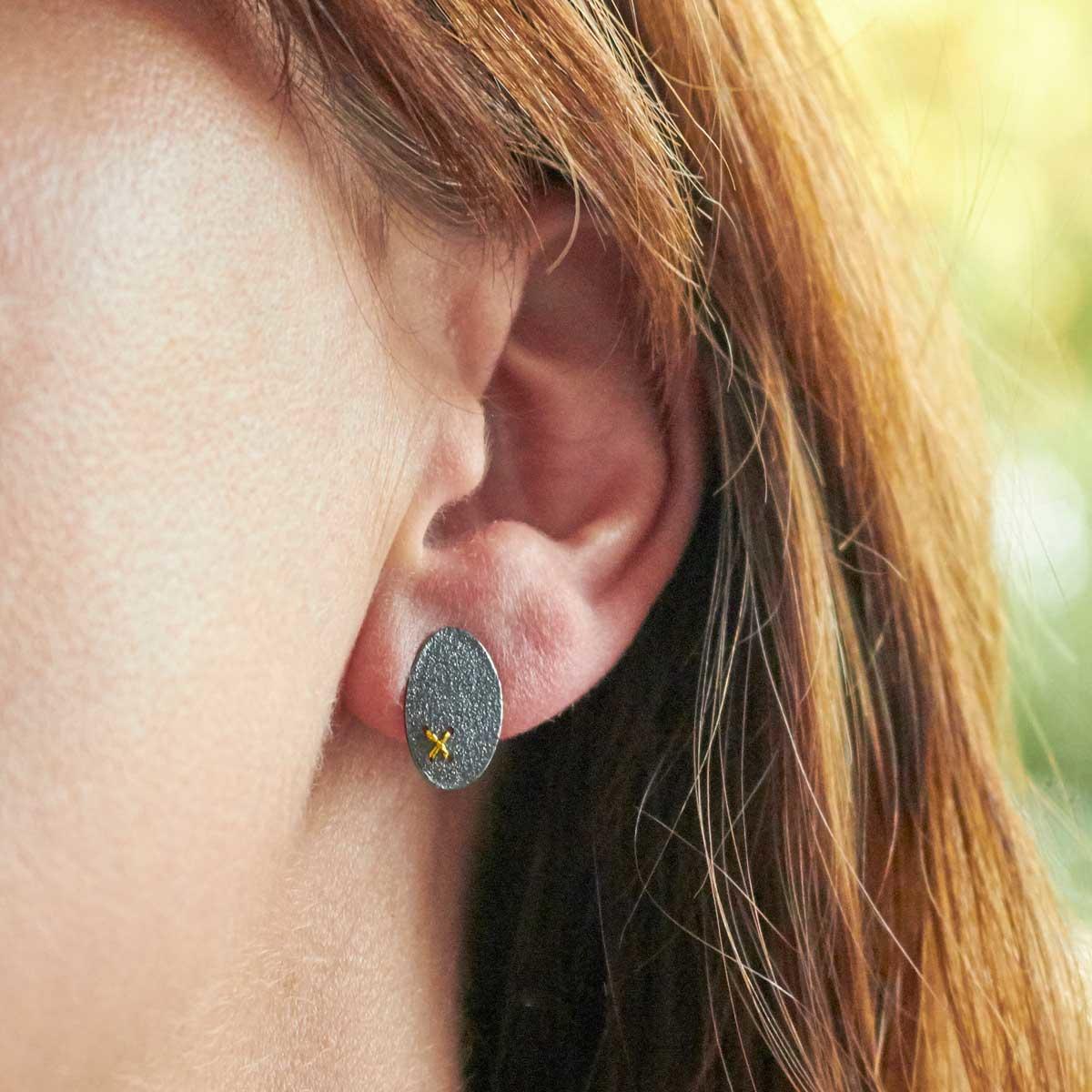 Oxidised (Blackened) Silver, Oval Studs with Tiny Gold Cross Stitch by Sara Bukumunhe